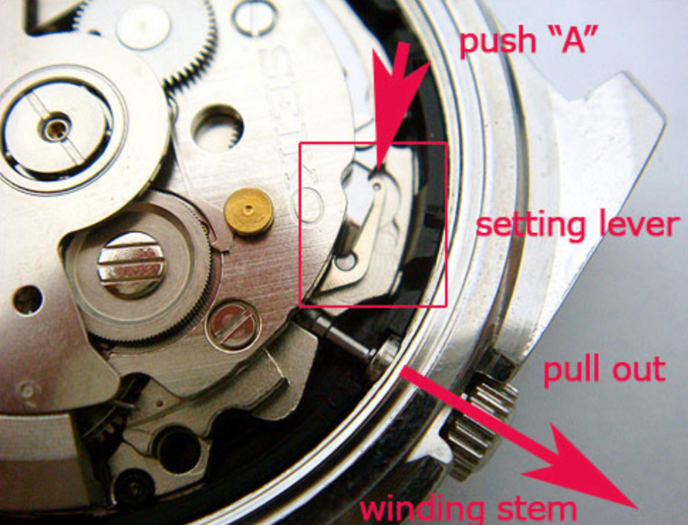 - Remove crown stem from movement by pressing the lever above the stem tunnel
